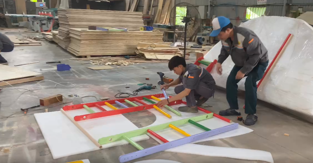 Tất cả thiết bị khu vui chơi đều được gia công tại xưởng riêng, đảm bảo thời gian sản xuất nhanh, kiểm soát chất lượng tốt và tiết kiệm chi phí trung gian.