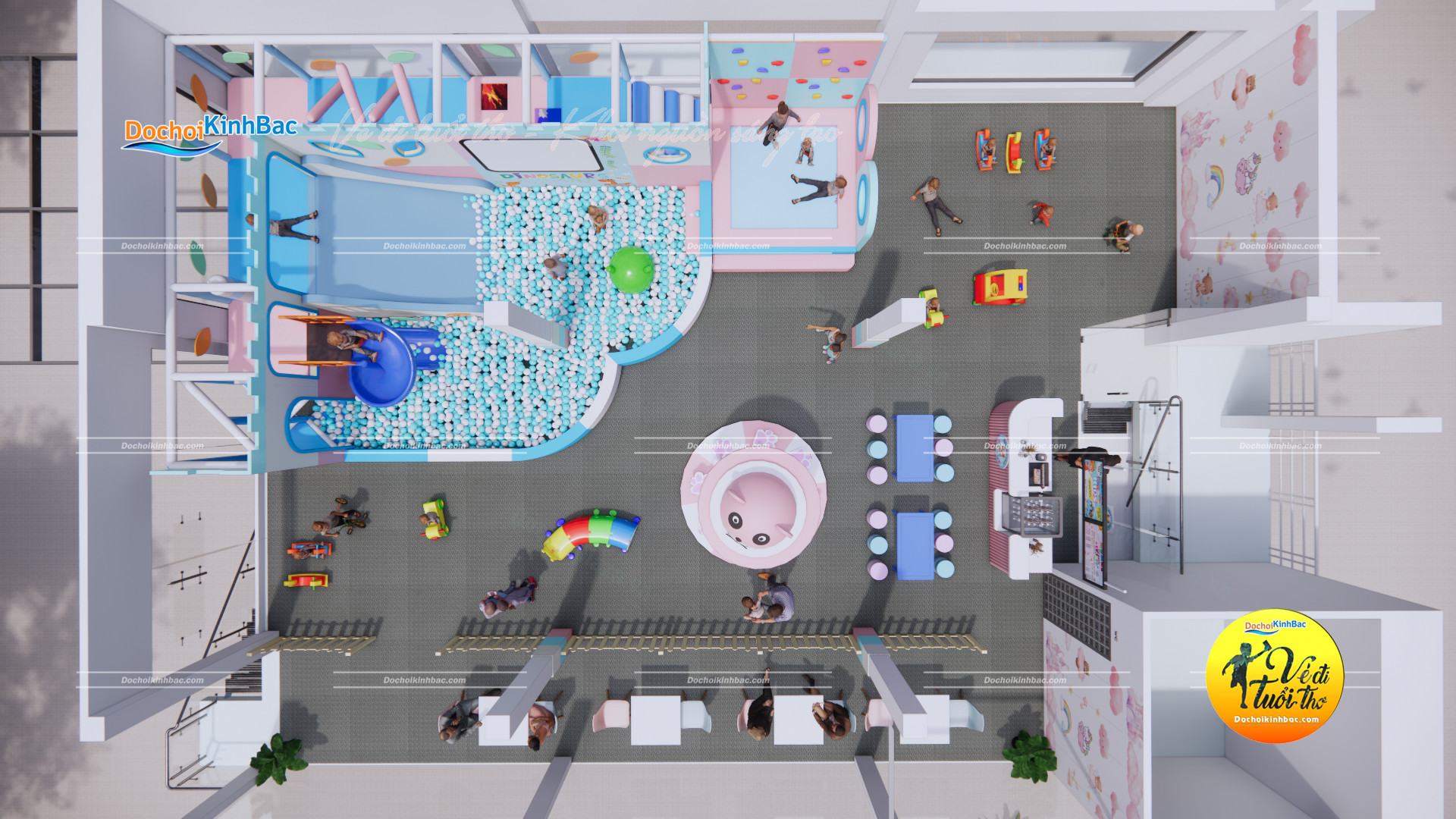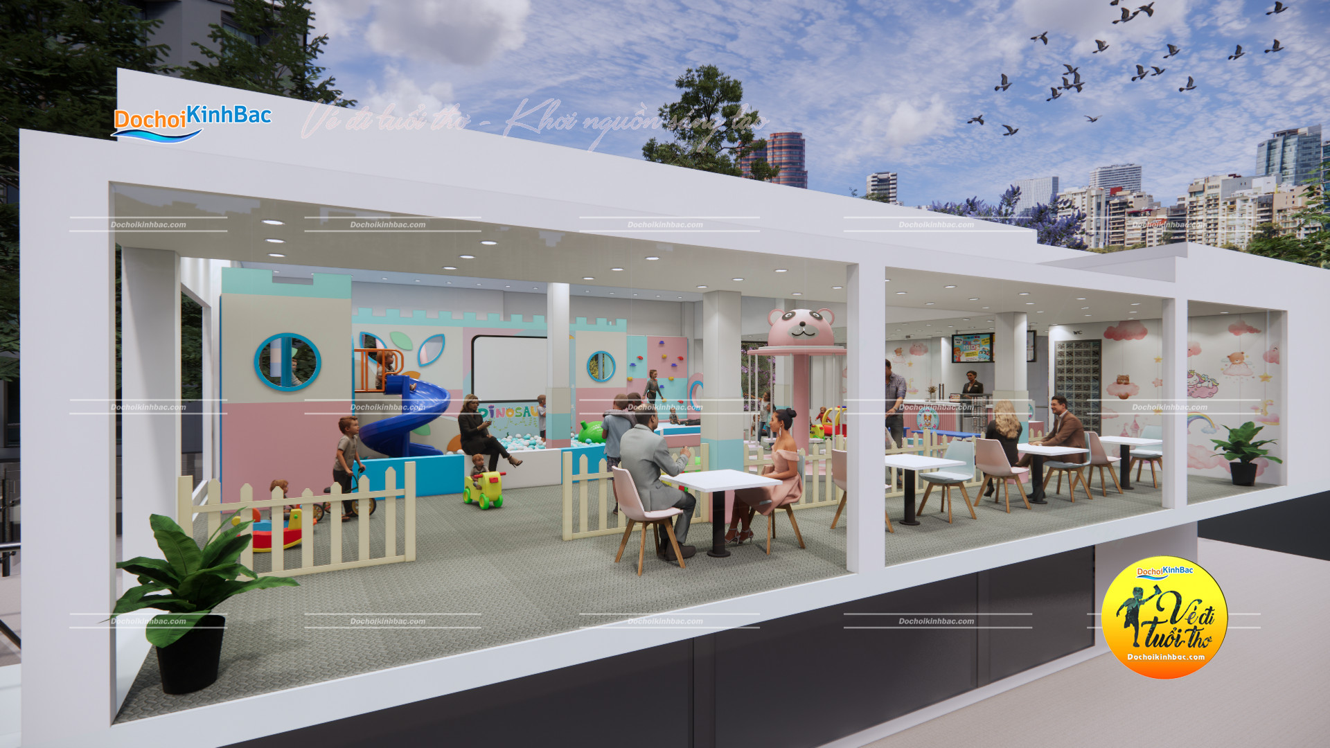 Khu vui chơi KVCTE1302 coffe kids diện tích 204 m2 thiết kế 3D khu vui chơi mới