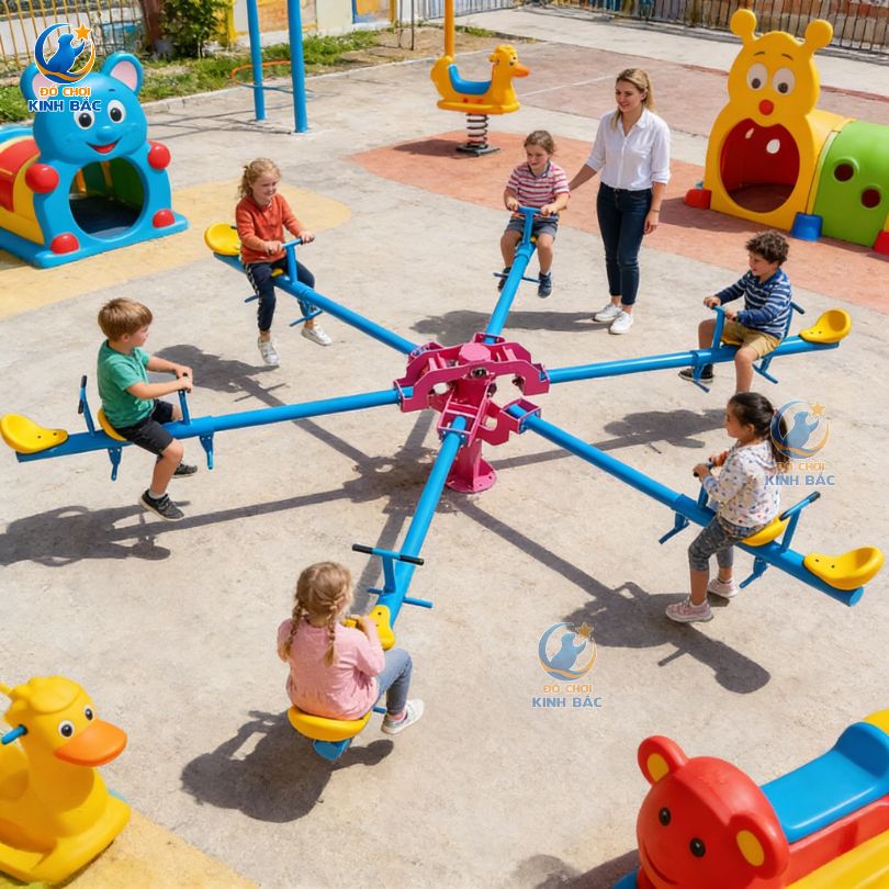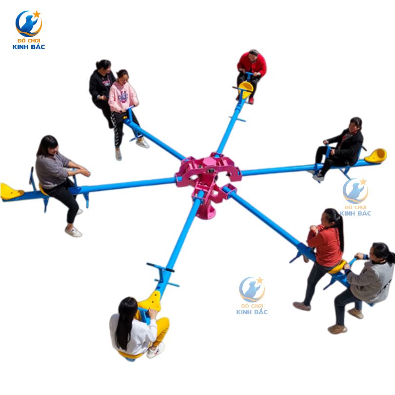Bập bênh liên hoàn nhiều chỗ ngồi là thiết bị vui chơi ngoài trời quen thuộc nhưng được cải tiến với thiết kế trung tâm trục xoay và nhiều tay đòn tỏa đều, cho phép nhiều người cùng tham gia chơi một lúc. Trò chơi mang lại cảm giác vận động nhịp nhàng, tăng tương tác và tạo không khí sôi động cho khu vui chơi.