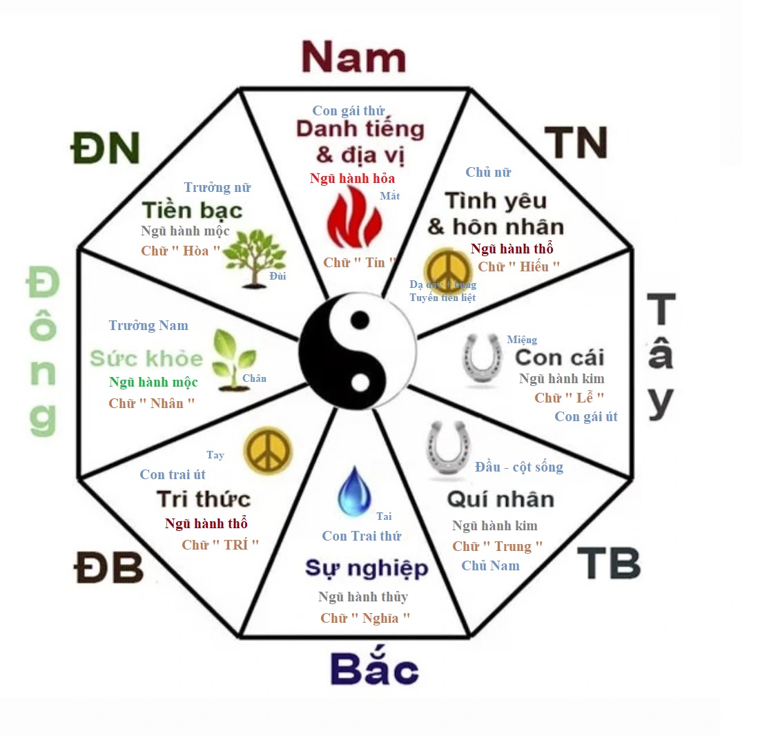 Hướng Tốt: Hướng phù hợp với ngũ hành của bạn sẽ mang lại nhiều lợi ích. Ví dụ: