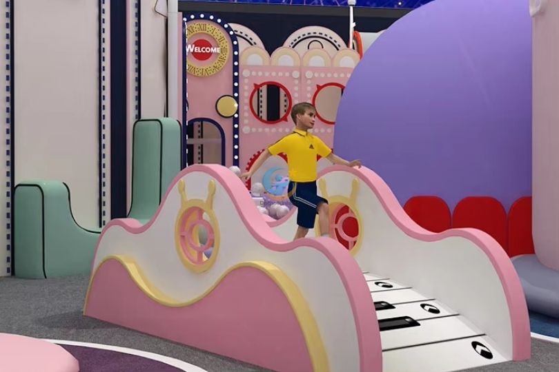 🌈 Màu sắc bắt mắt – dễ thu hút bé: Màu hồng pastel phối trắng dịu nhẹ, phù hợp với không gian khu vui chơi trẻ em hiện đại.