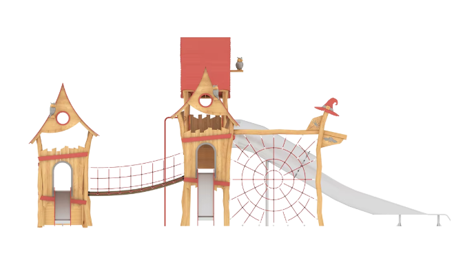 Cầu trượt liên hoàn gỗ được chế tác từ gỗ tự nhiên cao cấp (thường là gỗ thông, gỗ cao su hoặc gỗ tràm đã xử lý kỹ chống cong vênh, mối mọt). Kết cấu gồm nhiều khu vực liên kết với nhau, tạo thành một tổ hợp vui chơi thông minh: