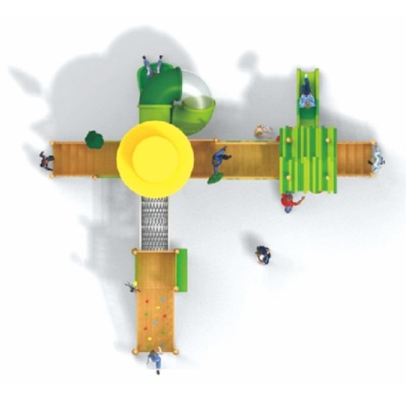 Cầu trượt liên hoàn gỗ được chế tác từ gỗ tự nhiên cao cấp (thường là gỗ thông, gỗ cao su hoặc gỗ tràm đã xử lý kỹ chống cong vênh, mối mọt). Kết cấu gồm nhiều khu vực liên kết với nhau, tạo thành một tổ hợp vui chơi thông minh: