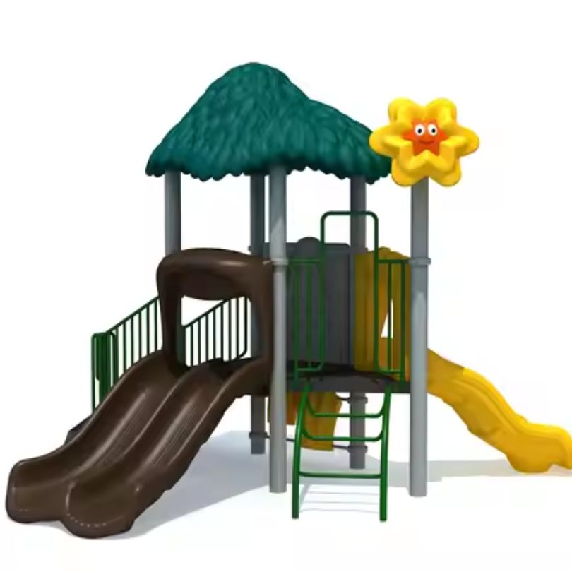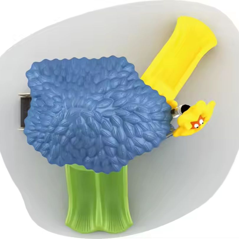 Cầu trượt mầm non đa năng với thiết kế 3 đường trượt, mái che hình nấm và chi tiết hình sao ngộ nghĩnh. Kích thước 470×400×340cm, phù hợp cho sân chơi ngoài trời tại trường mầm non, khu dân cư, trung tâm thương mại. Chất liệu nhựa nguyên sinh và khung thép mạ kẽm an toàn tuyệt đối cho trẻ nhỏ.
