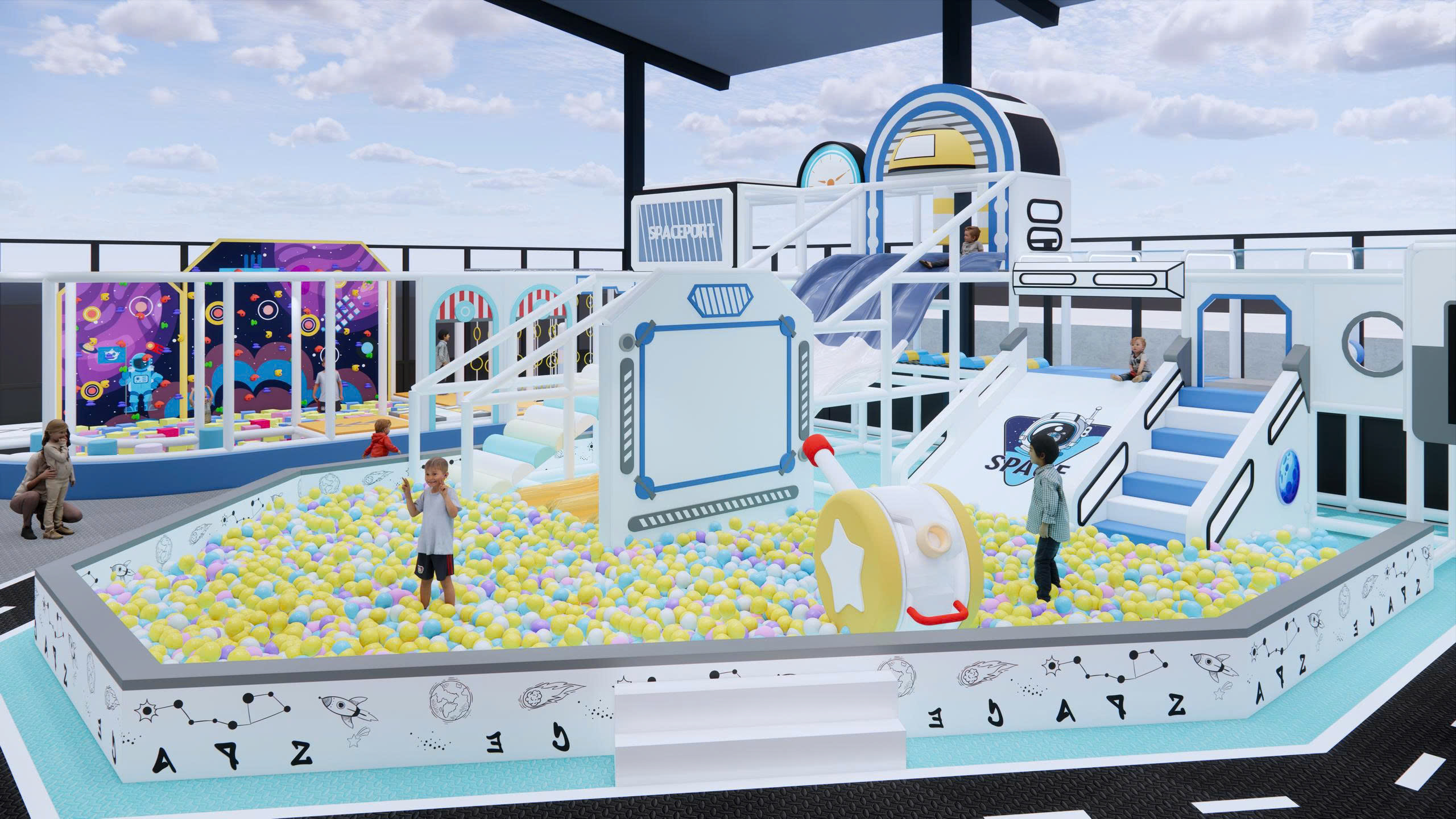 Một khu vui chơi chủ đề “Vũ trụ” có thể sử dụng gam màu tím – xanh đậm, kết hợp ánh sáng LED mô phỏng thiên hà, tàu không gian, hành tinh. Trẻ vừa chơi vừa khám phá, ghi nhớ mạnh mẽ, còn phụ huynh lại dễ chụp ảnh, chia sẻ – thương hiệu lan tỏa tự nhiên!