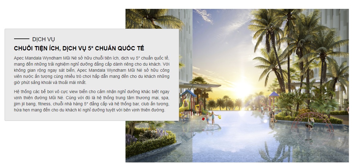 Tiện ích khác : Wc, nhà tắm trắng, công viên ....vv HÌnh ảnh và thông tin dự án : ĐIỂM NỔI BẬTAPEC MANDALA WYNDHAM MŨI NÉ – TUYỆT TÁC NGHỈ DƯỠNG BÊN VỊNH THIÊN ĐƯỜNG