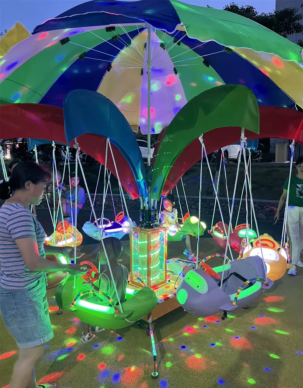 - Ánh sáng LED lung linh: Đu quay được trang bị hệ thống đèn LED hiện đại, tạo ra không gian rực rỡ, đẹp mắt vào ban đêm, khiến khu vui chơi của bạn thêm phần sinh động và hấp dẫn.