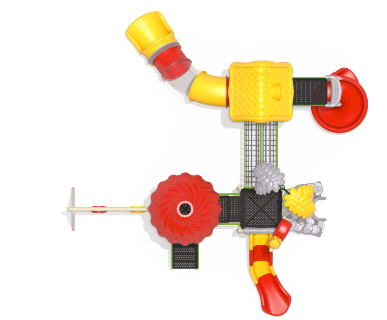 Tổ hợp cầu trượt liên hoàn tích hợp nhiều trò chơi như: máng trượt, leo núi, nhà bóng, đường hầm, xích đu... giúp bé phát triển thể chất, phản xạ và kỹ năng phối hợp.