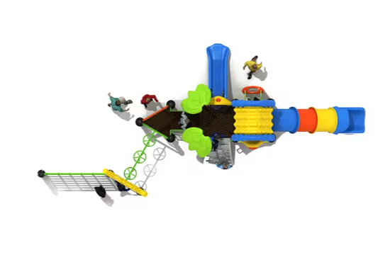 Tổ hợp cầu trượt liên hoàn tích hợp nhiều trò chơi như: máng trượt, leo núi, nhà bóng, đường hầm, xích đu... giúp bé phát triển thể chất, phản xạ và kỹ năng phối hợp.