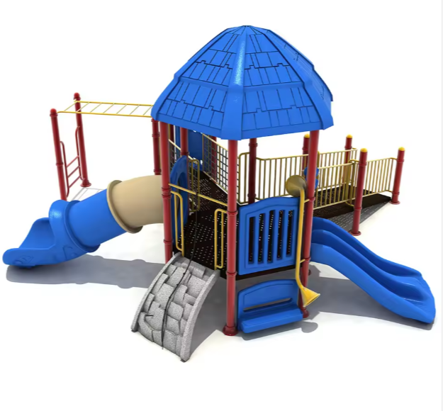 Tổ hợp cầu trượt liên hoàn tích hợp nhiều trò chơi như: máng trượt, leo núi, nhà bóng, đường hầm, xích đu... giúp bé phát triển thể chất, phản xạ và kỹ năng phối hợp.