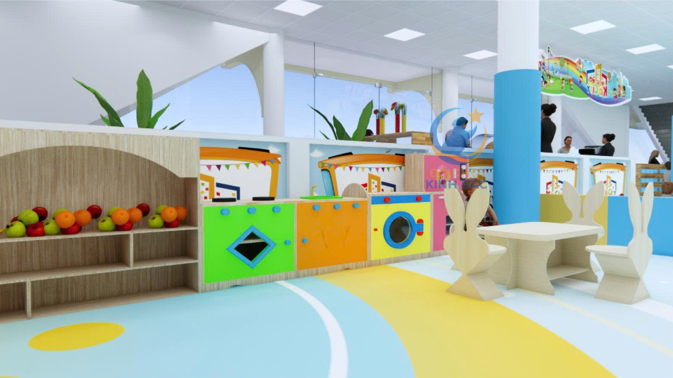 Mỗi gian hàng được thiết kế tỉ lệ chuẩn cho trẻ, màu sắc đồng bộ, giúp bé phát triển kỹ năng xã hội, giao tiếp, hợp tác và tư duy nghề nghiệp ngay từ nhỏ.