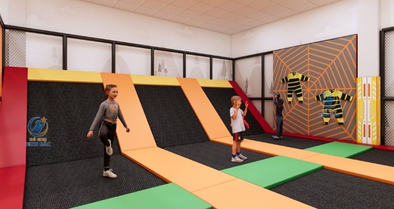 Một trong những điểm nhấn quan trọng nhất của TKKVCKB12. Hệ thống sàn nhún chia nhiều làn rộng, có khu bật nhảy tự do và khu nhún bật theo ô độc lập. Trampoline giúp trẻ: