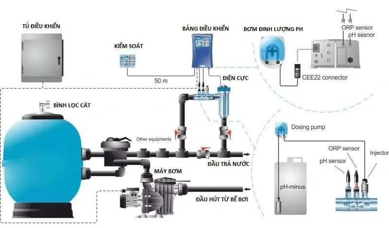 - Máy xử lý hóa chất tự động: Đảm bảo duy trì độ pH và hàm lượng clo trong nước ở mức an toàn, ngăn chặn vi khuẩn và vi sinh vật có hại.
