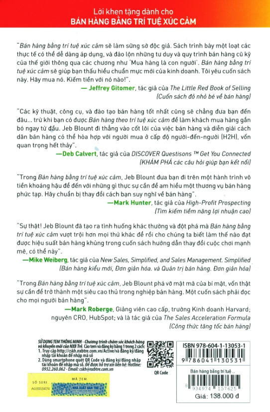Trong cuốn sách này, bạn sẽ học cách sử dụng trí tuệ cảm xúc để giao tiếp hiệu quả, xây dựng mối quan hệ với khách hàng, và tạo ra trải nghiệm tuyệt vời cho họ. Đặc biệt, cuốn sách giúp bạn hiểu được cách quản lý cảm xúc của khách hàng để chốt deal thành công trong mọi tình huống.