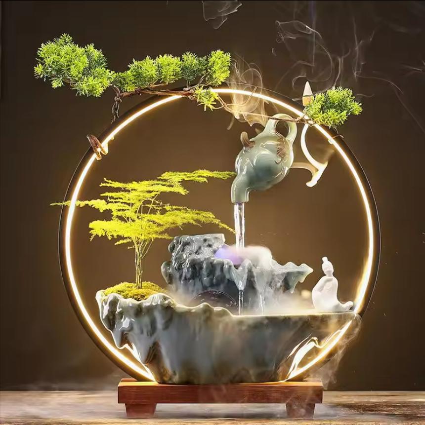 Cây xanh và ánh sáng sẽ giúp thác nước phong thủy trở nên sinh động và tạo sự cân bằng hài hòa giữa các yếu tố trong ngũ hành (Kim, Mộc, Thủy, Hỏa, Thổ). Đặt một chậu cây nhỏ bên cạnh thác nước sẽ giúp tạo cảm giác tự nhiên, trong lành và thư giãn.
