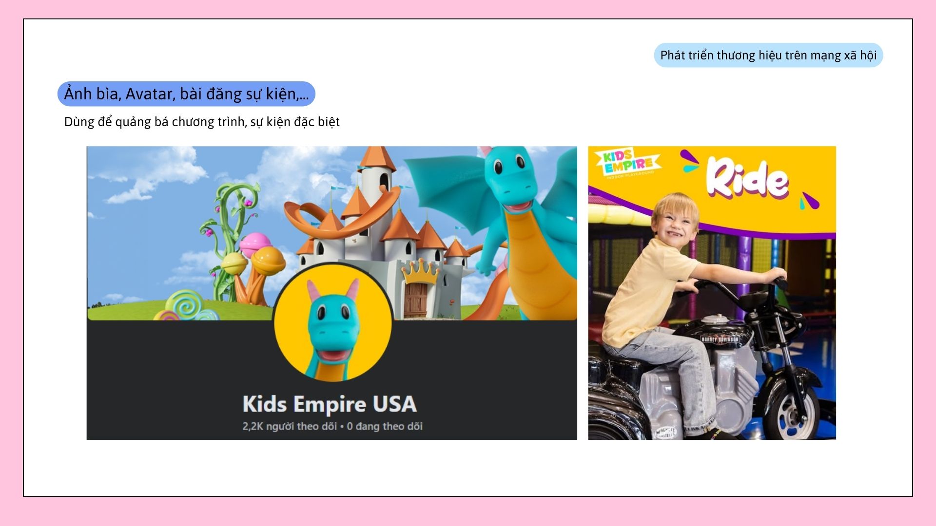 Bài đăng Facebook được thiết kế sẵn theo phong cách thương hiệu, phục vụ cho việc truyền thông khai trương, ưu đãi, thông báo sự kiện. Hình ảnh đồng bộ giúp fanpage khu vui chơi trông chuyên nghiệp và đáng tin cậy hơn.