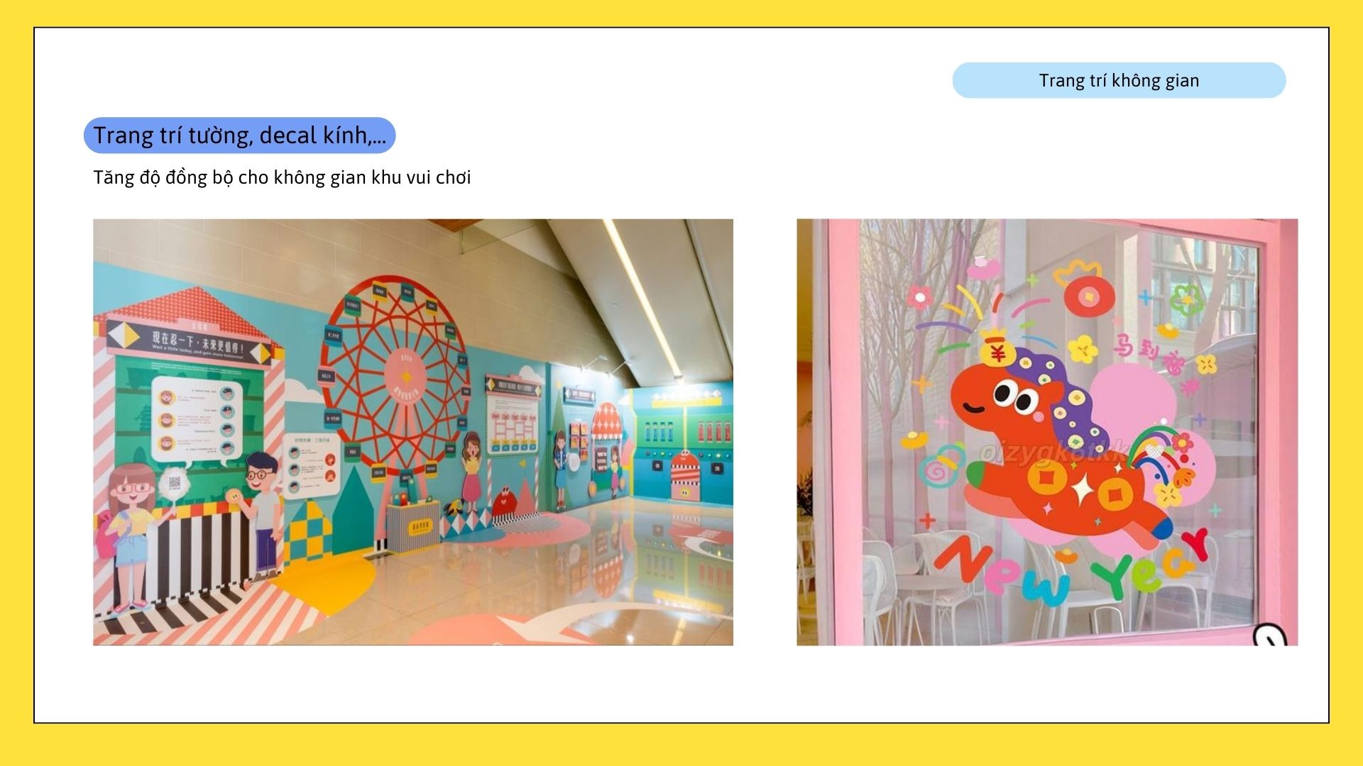 Tranh tường và decal được thiết kế theo chủ đề thương hiệu, kết hợp màu sắc, nhân vật và câu chuyện nhận diện, giúp không gian khu vui chơi trở nên sinh động, có chiều sâu và mang dấu ấn riêng.