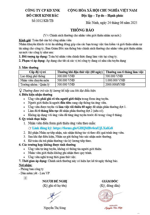 (V/v Chính sách thưởng cho nhân viên giới thiệu nhân sự mới.)