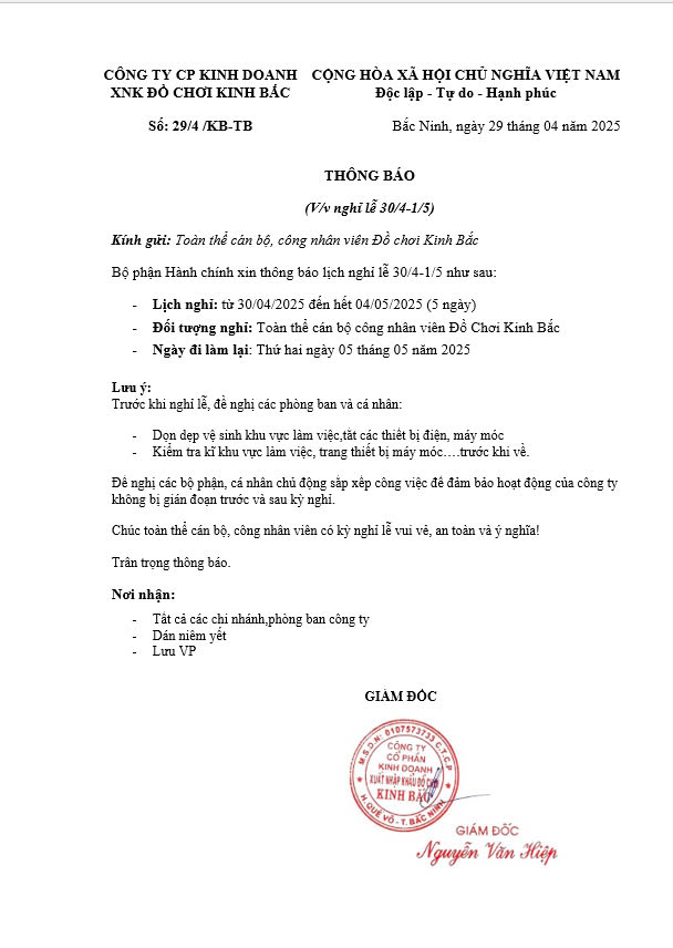 - Đối tượng nghỉ: Toàn thể cán bộ công nhân viên Đồ Chơi Kinh Bắc