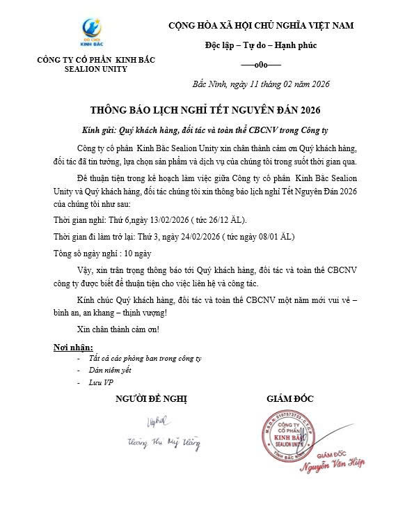 Để thuận tiện trong kế hoạch làm việc giữa Công ty cổ phần Kinh Bắc Sealion Unity và Quý khách hàng, đối tác chúng tôi xin thông báo lịch nghỉ Tết Nguyên Đán 2026 của chúng tôi như sau: