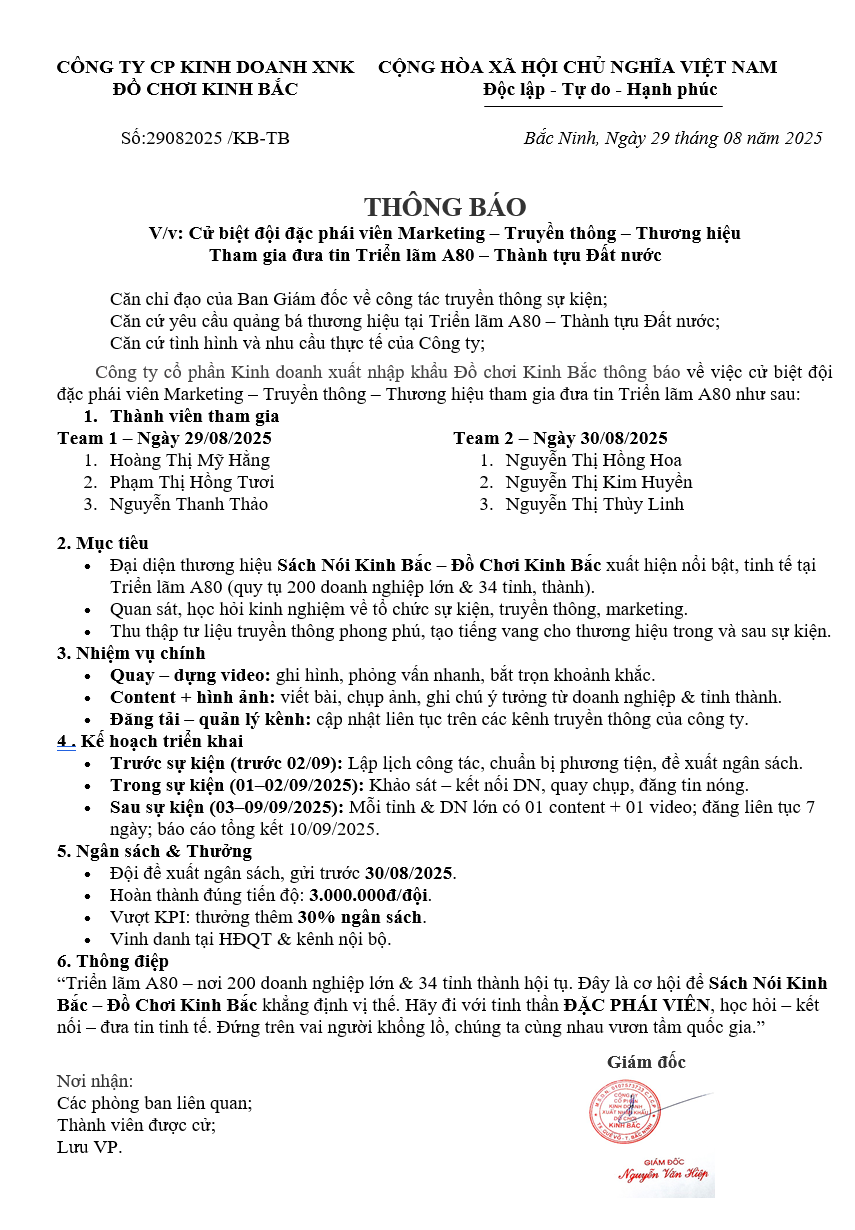 Công ty cổ phần Kinh doanh xuất nhập khẩu Đồ chơi Kinh Bắc thông báo về việc cử biệt đội đặc phái viên Marketing – Truyền thông – Thương hiệu tham gia đưa tin Triển lãm A80 như sau: