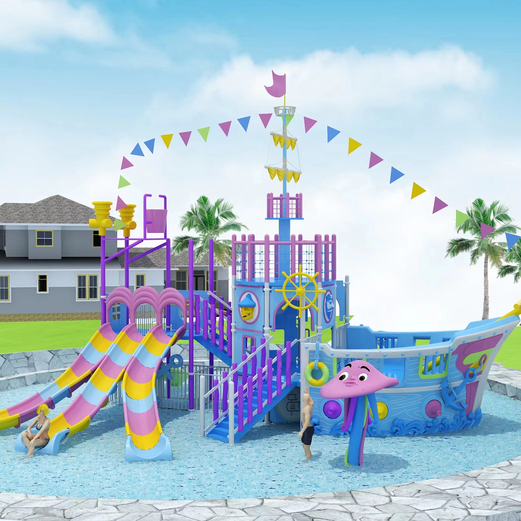 - Thiết kế sáng tạo: Kết hợp giữa thuyền và cầu trượt độc đáo, tạo ra một không gian vui chơi hấp dẫn và mới lạ.