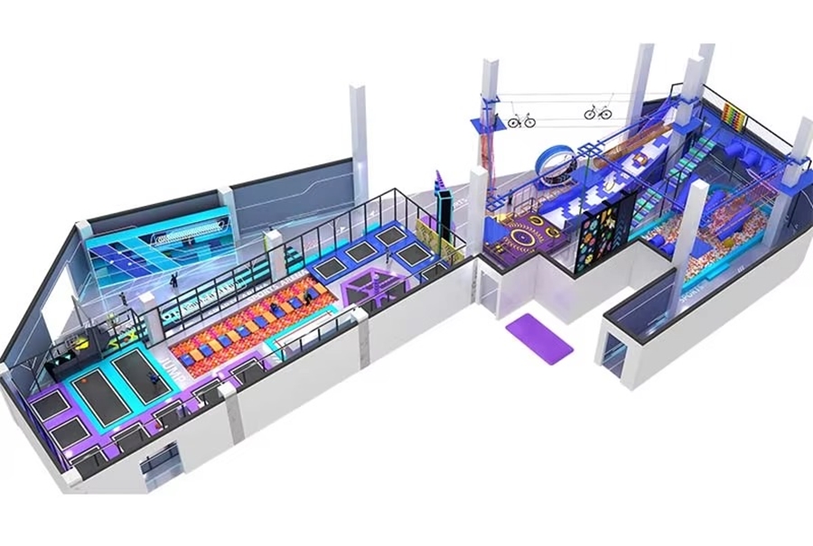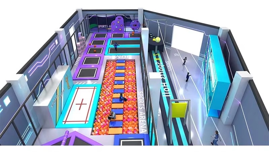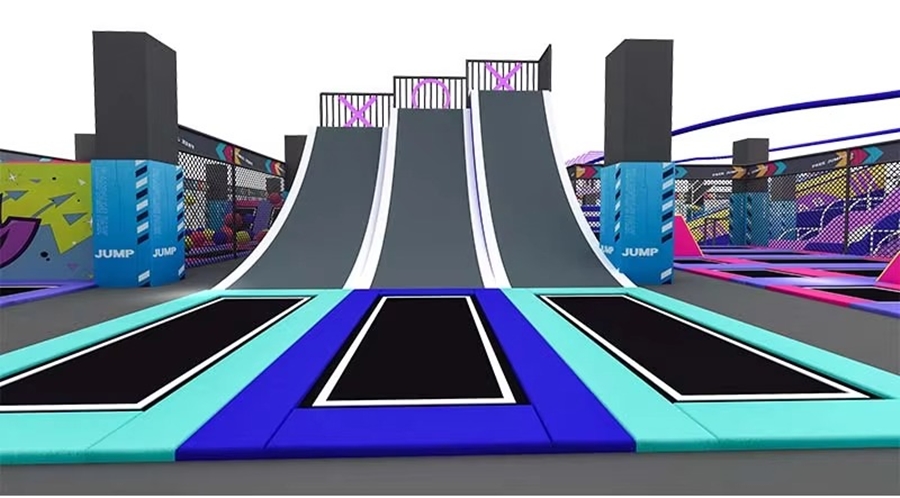 - Trampoline zone: Có thể bao gồm khu nhảy tự do, khu nhảy biểu diễn, và khu vượt chướng ngại vật. Khu vực này có thiết kế hiện đại, sử dụng chất liệu đàn hồi cao cấp, đảm bảo độ an toàn.