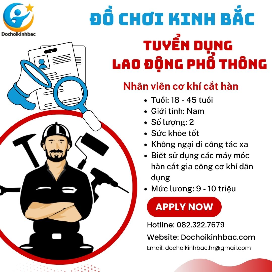 Đồ Chơi Kinh Bắc hiện cần tuyển Nhân viên Cơ Khí (Cắt – Hàn) làm việc trực tiếp tại xưởng Đông Du – Đào Viên – Bắc Ninh. Vị trí này phù hợp ứng viên có kinh nghiệm cơ khí hoặc mong muốn phát triển kỹ năng thực tế trong sản xuất và lắp đặt công trình.